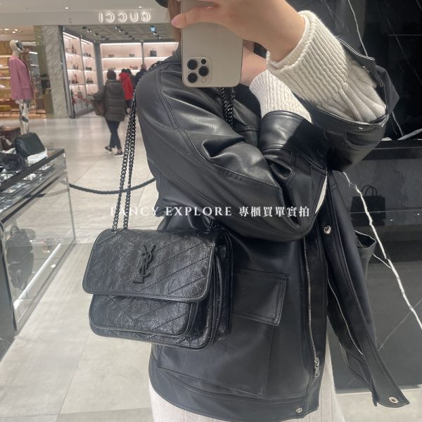 YSL BABY NIKI復古皮革肩背包-黑/黑鏈