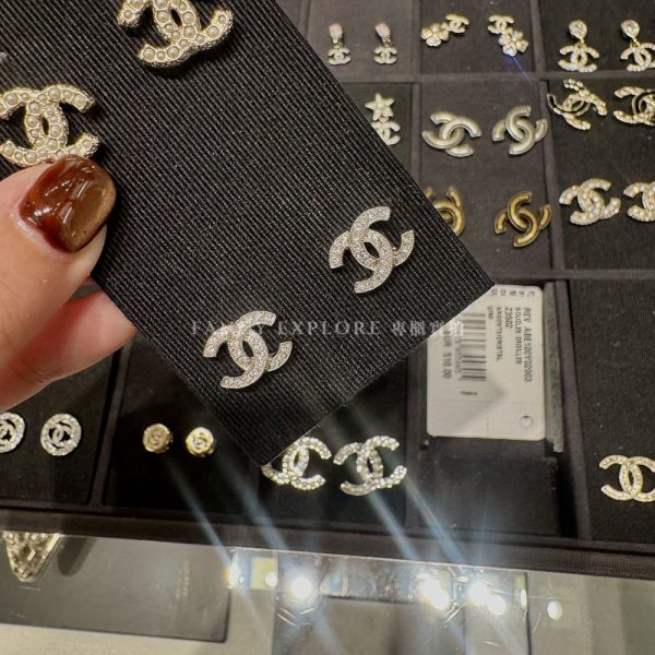 CHANEL 雙C水鑽耳環-銀